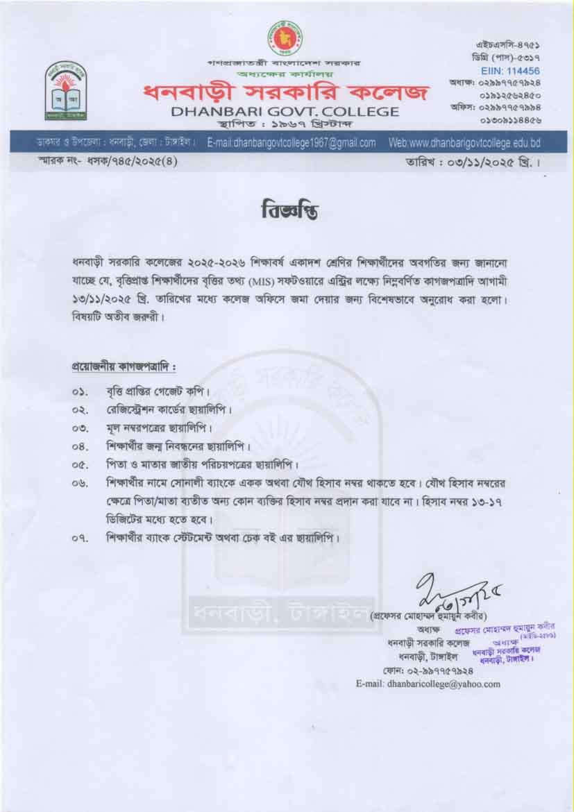ধনবাড়ী সরকারি কলেজের উচ্চমাধ্যমিক ২০২৪-২৫ শিক্ষাবর্ষের দ্বাদশ শ্রেণির দুই (০২) জন শিক্ষার্থীকে অছাত্রমূলক আচরণ ও কলেজের শৃঙ্খলা ভঙ্গের কারণে বহিস্কার আদেশ প্রসঙ্গে। |
