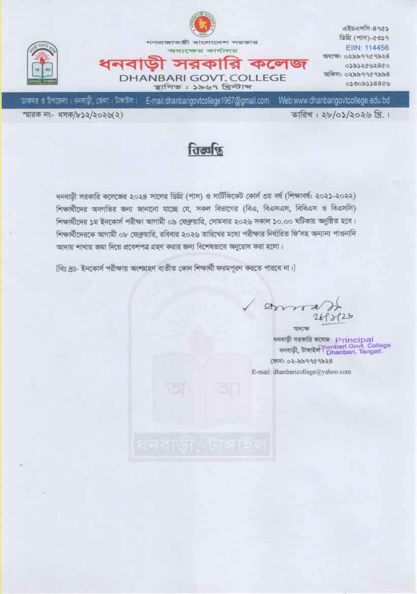 ২০২৪ সালের ডিগ্রি (পাস) ও সার্টিফিকেট কোর্স ৩য় বর্ষের (শিক্ষাবর্ষ: ২০২১-২০২২) শিক্ষার্থীদের ১ম ইনকোর্স পরীক্ষা সংক্রান্ত বিজ্ঞপ্তি। |