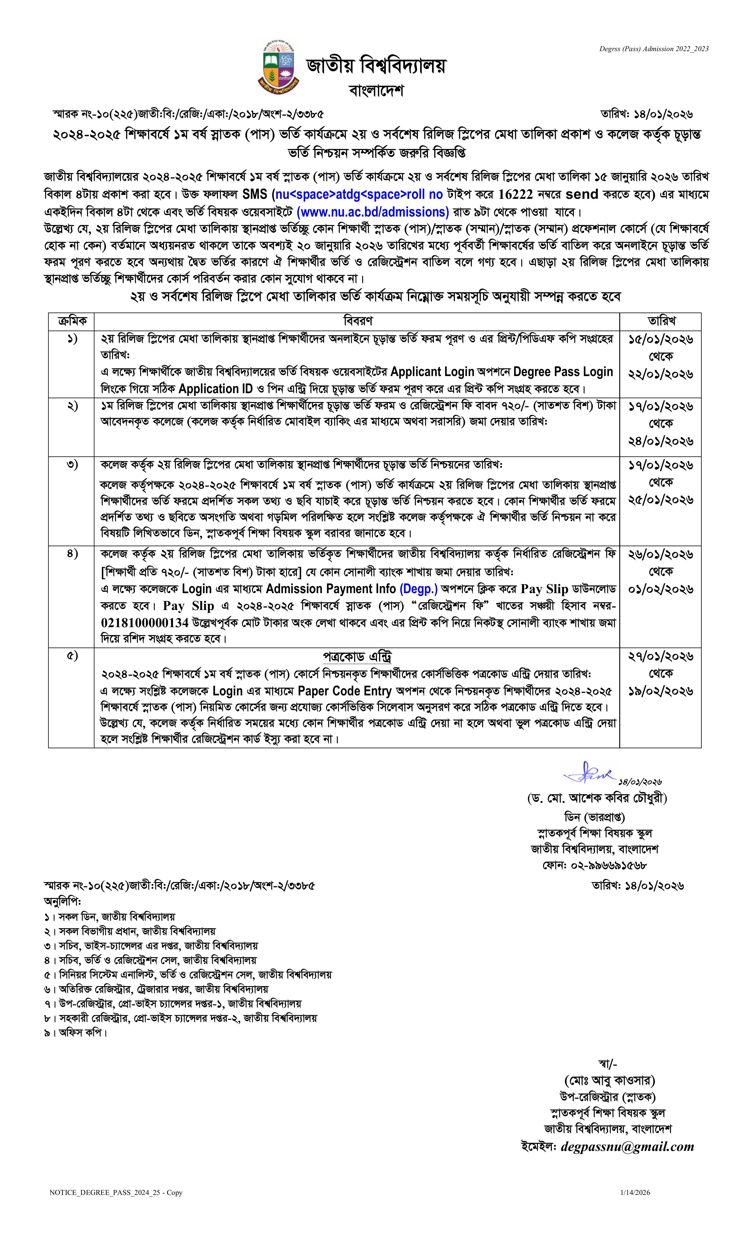 ২০২৪-২০২৫ শিক্ষাবর্ষে ১ম বর্ষ স্নাতক (পাস) ভর্তি কার্যক্রমে ২য় ও সর্বশেষ রিলিজ স্লিপের মেধা তালিকা প্রকাশ ও ভর্তি সম্পর্কিত জরুরী বিজ্ঞপ্তি। |